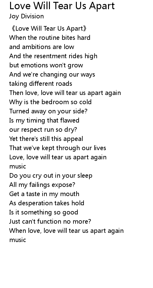 Official video for Love Will Tear Us Apart by Joy Division. Stream Joy Division's greatest hits here ▶ - Subscribe here ▶- Socials: Facebook | - Twitter | - - - Watch Joy Division other official music videos ▶ - Lyrics When routine bites hard And ambitions are low And resentment rides high But emotions won't grow And we're changing our ways, taking different roads Then love, love will tear us apart again Love, love will tear us apart again Why is the bedroom so cold? You've turned away on your side Is my timing that flawed? Our respect runs so dry Yet there's still this appeal That we've kept through our lives But love, love will tear us apart again Love, love will tear us apart again You cry out in your sleep All my failings exposed And there's a taste in my mouth As desperation takes hold Just that something so good Just can't function no more Then love, love will tear us apart again Love, love will tear us apart again Then love, love will tear it apart again Love, love will tear it apart again